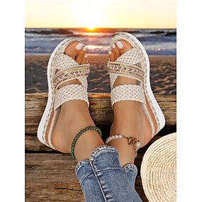 Sandalias de cuña trenzadas para mujer: sandalias de plataforma sin cordones de estilo boho con detalles de cuentas para verano, playa y atuendos casuales
