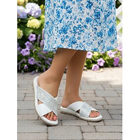 Sandalias marrones sin cordones para mujer con detalle de diamantes de imitación: cómodas sandalias de verano planas para uso diario, viajes al resort y salidas informales.