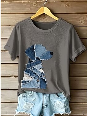 Mujer Camiseta Estampado Perro Básico Manga Corta Escote Redondo Tops regulares Diario Fin de semana Impresión personalizada Blanco Beige Gris