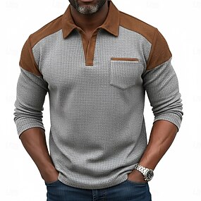 Hombre Camisetas polo con diseño de gofre Casual Calle Escote en Pico Cuello de gaviota Manga Larga Moda Básico Color sólido Bloque de Color Primavera & Otoño Otoño invierno Ajuste regular Negro Azul