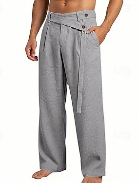Hombre Pantalones de lino Pantalones Pantalones de verano Pantalones de playa Botones Correa Cintura elástica Plano Comodidad Transpirable Longitud total Casual Diario Festivos Moda Estilo clásico