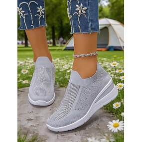 Zapatillas de cuña Flyknit rosa para mujer con detalles de diamantes de imitación: zapatillas deportivas ligeras y transpirables para uso informal y para caminar.