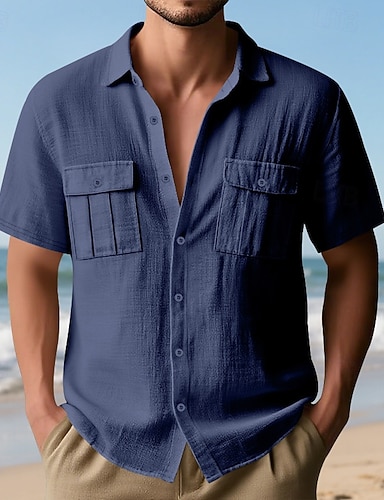 Hombre Camisa Camisa de lino Camisa de verano Ropa de playa Abotonar la camisa Camisa cargo Color sólido Vacaciones Calle Negro Blanco Azul Marino Azul Piscina Manga Corta Cuello Vuelto Verano