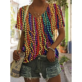 Mardi Gras Mujer Camiseta Estampado Graphic Geométrico Tribal Bohemia Vintage Elegante Manga Corta Escote en Pico Tops regulares Diario Noche Fin de semana Amarillo Rojo Morado Naranja Verde Trébol