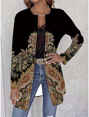 Mujer Chaqueta casual Cómodo Transpirable Bolsillo Frente Abierto Elegante Casual Boho Vintage Floral Casual Ropa Cotidiana Frente Abierto Largo Cuello redondo Ajuste regular Manga Larga Ropa de calle