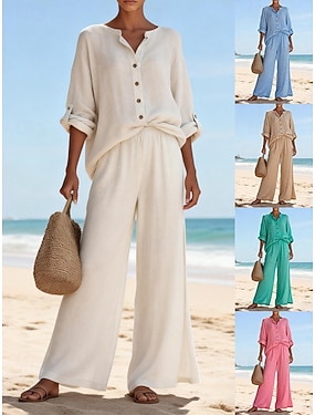 Mujer Camisa Conjuntos de lino y algodón Conjuntos de dos piezas Pantalones de lino Manga Corta Color sólido Azul Piscina Azul Marino Gris Verano Ajuste regular