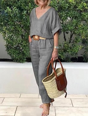 Mujer Camisas de algodón y lino Blusa Conjuntos de pantalones Manga Corta Escote en Pico Color sólido Activo Básico Vacaciones Casual Diario Azul Piscina Amarillo Verde Ejército Verano Ajuste regular