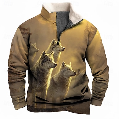 Hombre Animal Lobo Vellón Sudadera Moda Casual 3D Escote Chino Cremallera de un cuarto Exterior Vacaciones Regalo Ropa de calle Burdeos Marrón Media Cremallera Otoño Invierno Diseñador S M L XL XXL