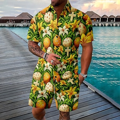 Semana Santa Hombre huevos de Pascua 2 piezas Conjuntos de camisas Conjunto de camisa Manga Corta Pantalones cortos Cuello Vuelto Casual Exterior Casual Diario Impresión 3D Verano Amarillo