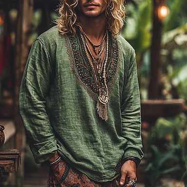 Hombre Camisa Camisa de lino Estilo vikingo Camisa de manga corta Camisa de verano Ropa de playa Geométrico Vacaciones Calle Amarillo Morado Verde Trébol Manga Larga Escote en Pico Verano Primavera