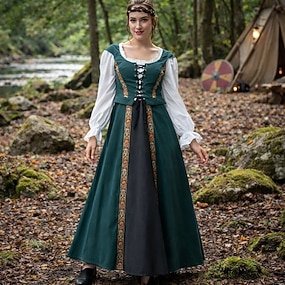 Retro Antiguo Medieval Renacimiento Vestidos Encaje Bloque de color Disfraz Mujer Celta Fantasía Real Víspera de Todos los Santos Carnaval Mascarada LARP Adulto Vestido
