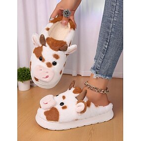 Bonitas pantuflas de peluche de vaca para mujer con diseño de animal en 3D y forro suave: cómodas pantuflas de invierno para el hogar y como regalo navideño.
