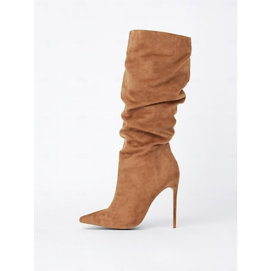 Botas altas hasta la rodilla holgadas de ante marrón para mujer: botas de vestir con cremallera y tacón de aguja con punta puntiaguda para atuendos de otoño, fiestas y ropa de noche.