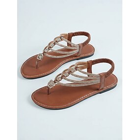 Sandalias de tira en T para mujer, color marrón oscuro, cómodas sandalias planas informales con tachuelas de perla fuax y hebilla ajustable para playa, viajes y vacaciones en verano. &ropa de uso