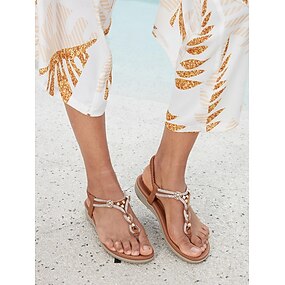 Sandalias bohemias con tiras en T y cuentas para mujer: zapatos casuales de verano planos con tiras elásticas en el tobillo, perfectos para la playa y el uso diario