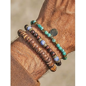 Conjunto de pulseras bohemias para hombre con cuentas de madera, turquesa y cáscara de coco, 3 pulseras elásticas apilables para vacaciones en la playa, atuendos casuales de verano y uso diario.