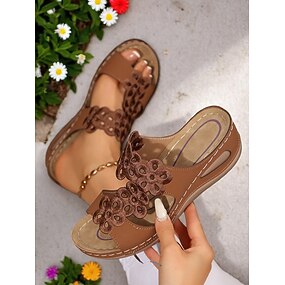 "Sandalias planas de piel sintética con aberturas marrones para mujer con correa ajustable: zapatos casuales de verano para uso diario y vacaciones"