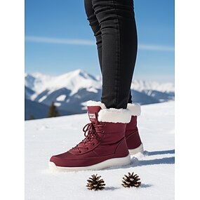 Botas de invierno burdeos con suela gruesa para mujer: botines deportivos con cordones y forro de piel, ideales para uso casual en la calle, viajes y caminatas.