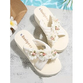Sandalias florales para mujer: zapatos de playa planos estilo bohemio con diseño de flores en 3D para vacaciones de verano y uso casual.