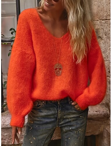 Mujer Pulóveres Moda Ropa de calle Diario Color sólido Escote en Pico De Punto Manga Larga Tops largos Tejer Exterior Noche Naranja Otoño Invierno
