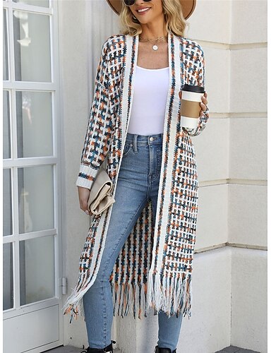 Mujer Pulóveres Cárdigan Elegante Moda Ropa de calle Plaid Estriado Frente Abierto Borlas De Punto Manga Larga Tops largos Tejer Exterior Diario Fin de semana Negro Amarillo Primavera Otoño