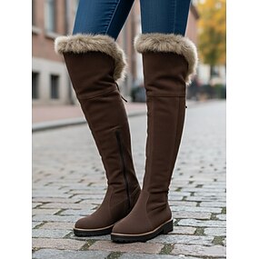 Botas de ante sintético marrón por encima de la rodilla para mujer con ribete de piel sintética: calzado de invierno cómodo y elegante para mayor calidez