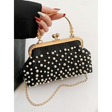 Bolso de mano vintage con cuentas de perlas: elegante bolso de noche para mujer con marco dorado y correa de cadena para bodas, fiestas y eventos formales negro blanco caqui