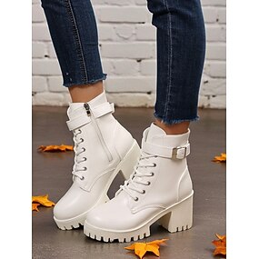 Botas blancas de tacón grueso con cordones para mujer, elegantes botas de combate de tacón alto con hebilla ajustable, calzado de moda para ocasiones informales y al aire libre.