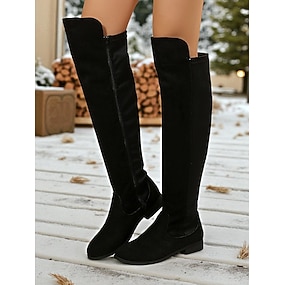 Botas negras por encima de la rodilla para mujer: botas de invierno de ante sintético con tacón bajo para ropa de calle y conjuntos informales.