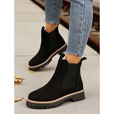 Botas holgadas de media caña de ante sintético negro para mujer: botines de invierno de tacón plano, calzado cómodo e informal para climas fríos.