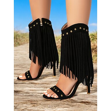 Sandalias con flecos estilo western para mujer: sandalias de tacón abierto de ante bohemio marrón con detalles de tachuelas para un estilo vaquera, festivales de música y salidas de verano.