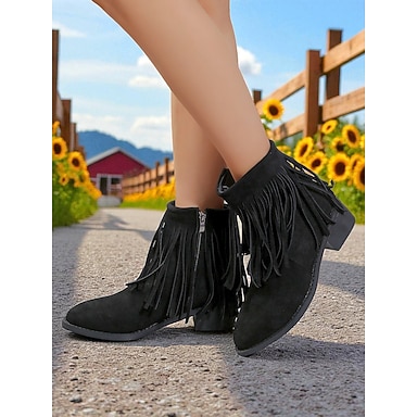 Botines de ante sintético con flecos para mujer: botas cortas de tacón bajo estilo western para looks de otoño, ropa urbana informal y eventos al aire libre.