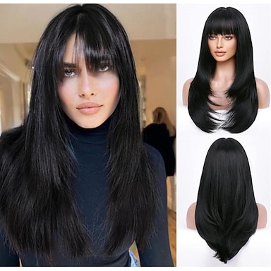 Pelucas sintéticas Uniformes Disfraces carrera Princesa Recto Liso Natural Parte media Corte a capas Con flequillo Hecho a Máquina Peluca 26 pulgadas Negro Pelo sintético Mujer Cosplay Fiesta Moda
