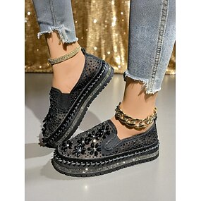 Zapatillas negras sin cordones con adornos de diamantes de imitación para mujer: calzado deportivo ligero, brillante y moderno para uso informal