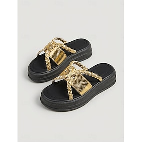 Sandalias de cuña con alpargatas tejidas en negro y dorado para mujer: estilo bohemio vacacional, cómodas sandalias de plataforma con punta abierta para playas y viajes de verano.