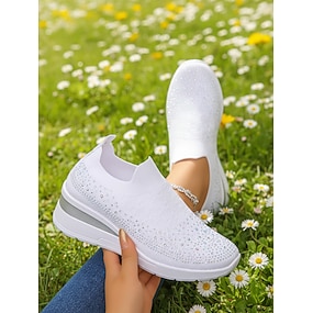 Zapatillas deportivas blancas de cuña de punto para mujer: calzado informal ligero y transpirable para actividades al aire libre, caminar, viajar y uso diario.