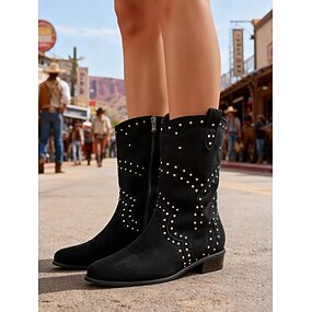 Botines de ante marrón estilo western para mujer con detalle de tachuelas y tacón cuadrado, ideales para salidas informales, festivales y uso diario.