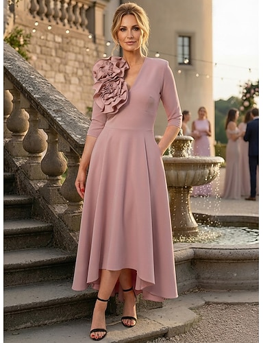 Corte A Hasta el Tobillo Vestido formal Vestido de Madrina Manga 3/4 Escote en Pico Elegante Vintage Formal Invitado a la boda Reunión Familiar Crepé elástico con Flores 3D
