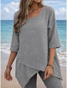 Mujer Blusa Camisa de lino sintético Botones Asimétrico Color sólido Elegante Casual Manga 3/4 Cuello Barco Tops largos Diario Gris Verano Primavera Otoño