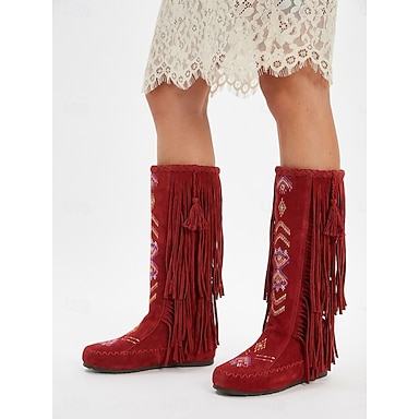 Botas hasta la rodilla de gamuza sintética bordada con flecos para mujer, estilo bohemio para festivales y ropa informal
