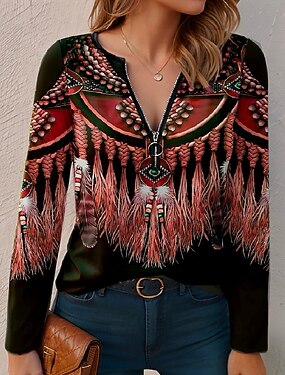 Mujer Camiseta Cremallera Estampado Graphic Tribal Vintage Moda Elegante Manga Larga Cuello Barco Escote en Pico Tops regulares Diario Azul Piscina Rojo Marrón claro Morado Verde Trébol Primavera