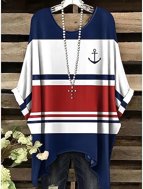 Mujer Blusa Bloque de Color Graphic Geométrico Ancla Vintage Casual Manga Corta Manga Murciélago Cuello Barco Tops regulares Diario Ropa de playa Ropa de vacaciones Blanco Rojo Verano Primavera