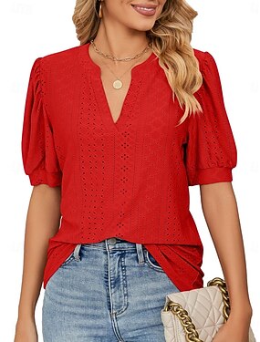 Mujer Camiseta Ojal Plano Moda Moderno Casual Manga Corta Escote en Pico Tops regulares Diario Fin de semana Negro Blanco Amarillo Rojo Verde Trébol Verano Primavera