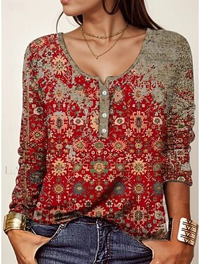Camiseta de Mujer de Manga Larga Gráfico Tribal Vintage Estilosa Clásica Manga Larga Cuello Redondo Regular Tops Estampado Diaria Roja Azul Primavera Otoño Pretemporada