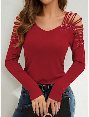 Mujer Camiseta Camiseta superior Lentejuelas Malla Color sólido Elegante Moda Clásico Manga Corta Escote en Pico Tops regulares Diario Noche Fin de semana Negro Rojo Verano Primavera