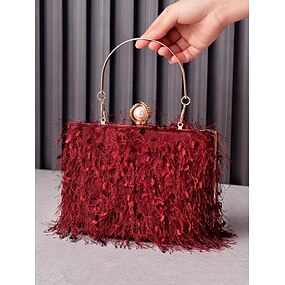 Bolso de mano para mujer para fiesta navideña: elegante bolso de noche con plumas rojas y verdes, asa dorada y cierre de perla. Regalo navideño para mujer. Estilo festivo y elegante para celebraciones navideñas.