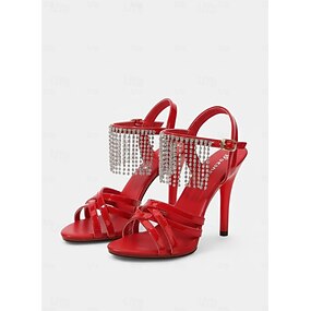 Sandalias de tacón de aguja de charol rojo para mujer con flecos de diamantes de imitación para ocasiones formales, cócteles y celebraciones.