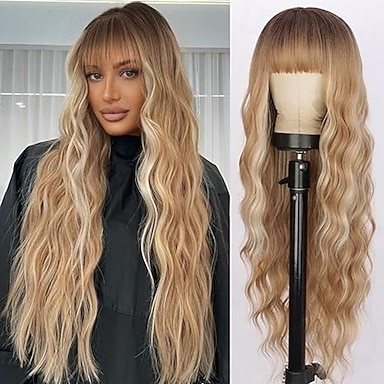 Pelucas sintéticas Rizado Ondulado Flequillo recto Con flequillo Hecho a Máquina Peluca 26 pulgadas Rubio Pelo sintético Mujer Bonito Cosplay Fiesta Rubio