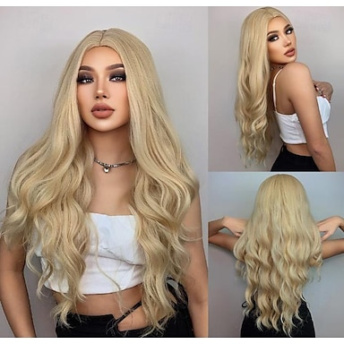 Peluca rubia platino larga peluca rubia ondulada natural de 28 pulgadas peluca rubia de parte media pelucas rubias de pelo sintético para mujeres