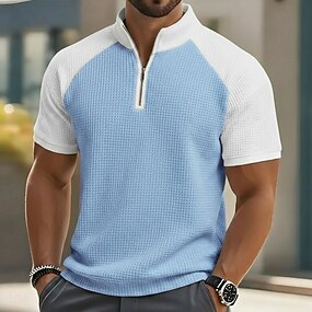 Hombre Camisetas polo con diseño de gofre Casual Festivos Cuello Mao Manga Corta Básico Moderno Plaid Bloque de color Bloque de Color Botones Verano Primavera Primavera verano De Gran Tamaño Azul